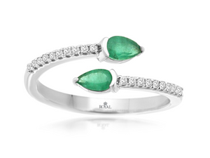 14K white gold ring by Royal featuring 0.45 cttw of lush emeralds accented by 0.12 cttw diamonds. The vivid green stones are beautifully offset by sparkling diamond accents for a fresh, eye-catching look.