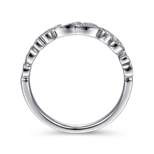 14K white gold floral stackable ring by Gabriel featuring 0.14cttw white diamonds. Petal-inspired details create a soft, feminine silhouette with delicate sparkle. Beautiful worn alone or stacked with other rings.