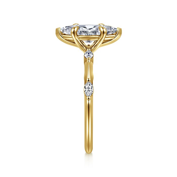 14K yellow gold semi-mount engagement ring by Gabriel featuring a marquise-shaped setting accented with 0.17cttw of VS2 clarity, G-H color diamonds. Crafted to hold the center stone of your choice.