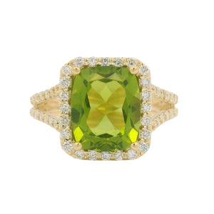 14K yellow gold ring by Royal featuring a bold 4.25 ct peridot center stone accented by 1.00 cttw of diamonds. The vivid green peridot brings fresh energy and summer vibes, while the surrounding diamonds add radiant sparkle for a balanced, eye-catching look.