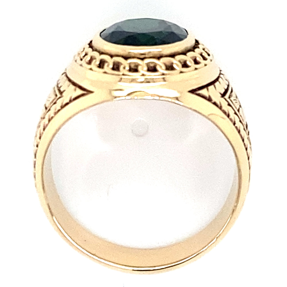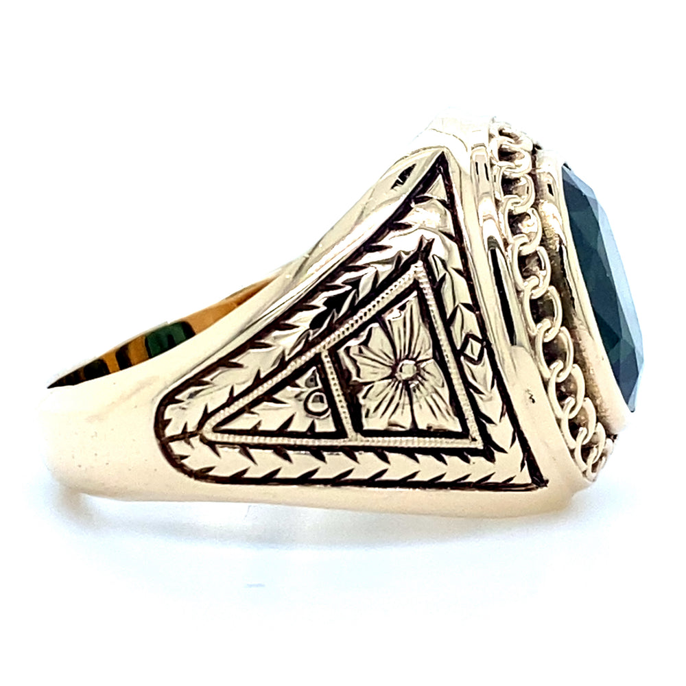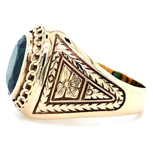Estate 10K Yellow Gold (1) 12mm x 10mm Oval Cut Synthetic Emerald Signet Style Ring with Floral Motif size 11.5