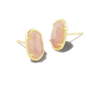 A polished pair of studs in our signature shape. The Grayson Gold Stud Earrings are sophisticated and unique, featuring our iconic silhouette inlaid with a genuine Rose Quartz stone A soft, blushing hue courtesy of the microscopic inclusions within, this genuine and undyed stone inspires love, healing, and nurturing.