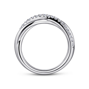 Sterling silver criss-cross ring by Gabriel featuring 0.32cttw of pavé-set white sapphires. The overlapping band design creates a sculptural look with layered sparkle and modern elegance.