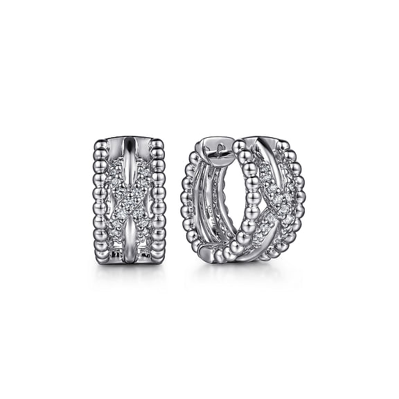 Sterling silver twisted Bujukan huggie earrings by Gabriel featuring 0.26cttw of white sapphires. The design combines twisted metalwork with the signature beaded texture, offering dimension and subtle sparkle in a close-fitting, modern silhouette.